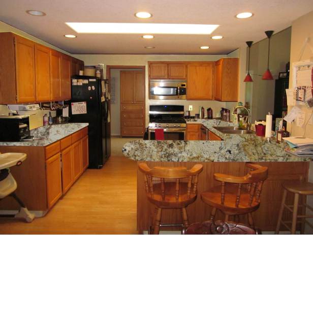 Jim and I were perusing a granite catalog and solemnly realized that the granite look that we both really liked would not work in our current kitchen. With the light honey oak floor and the medium honey oak cabinets….adding a granite counter with deep honey & gold patterns throughout would be too…. well….. honey.