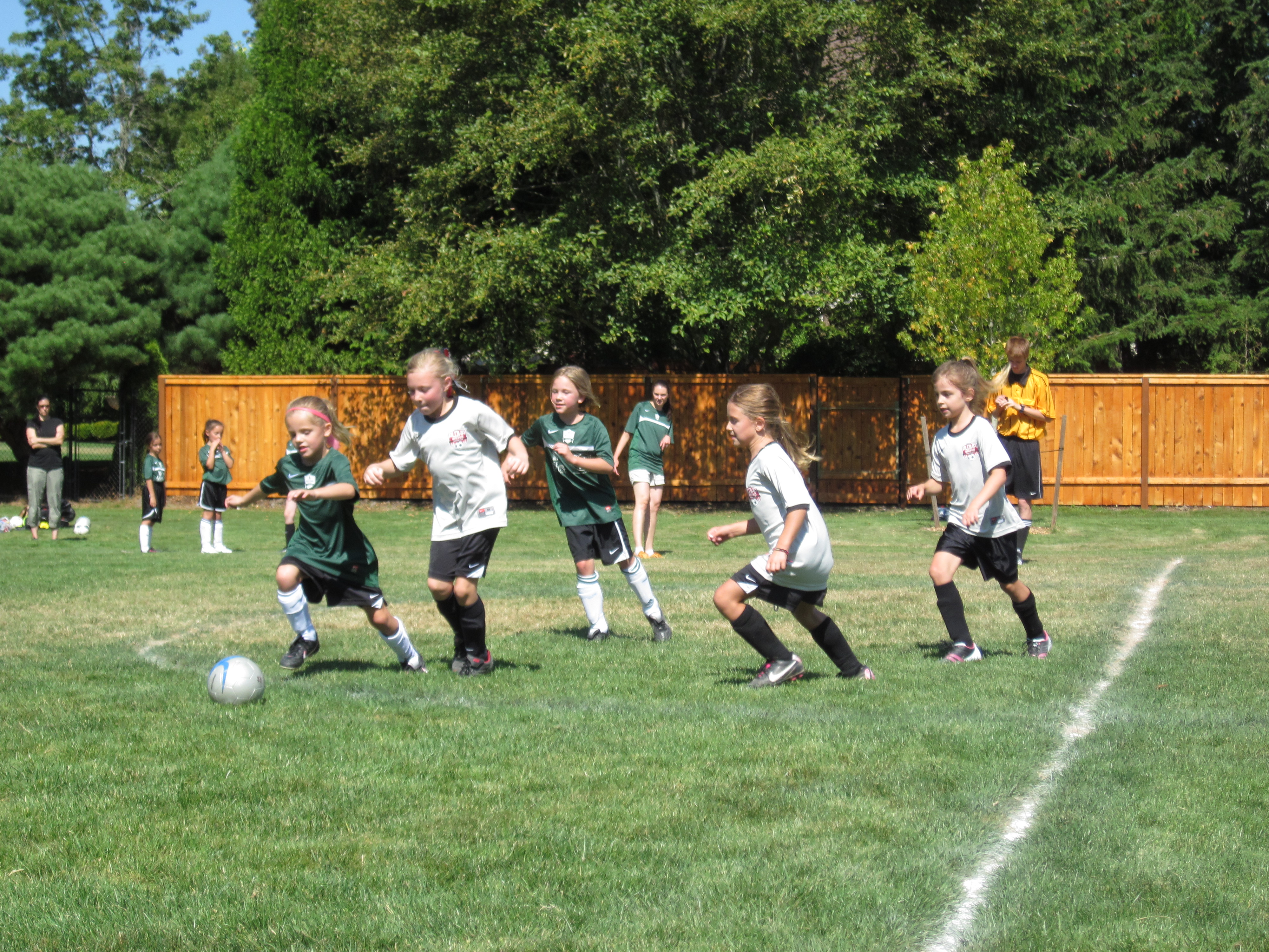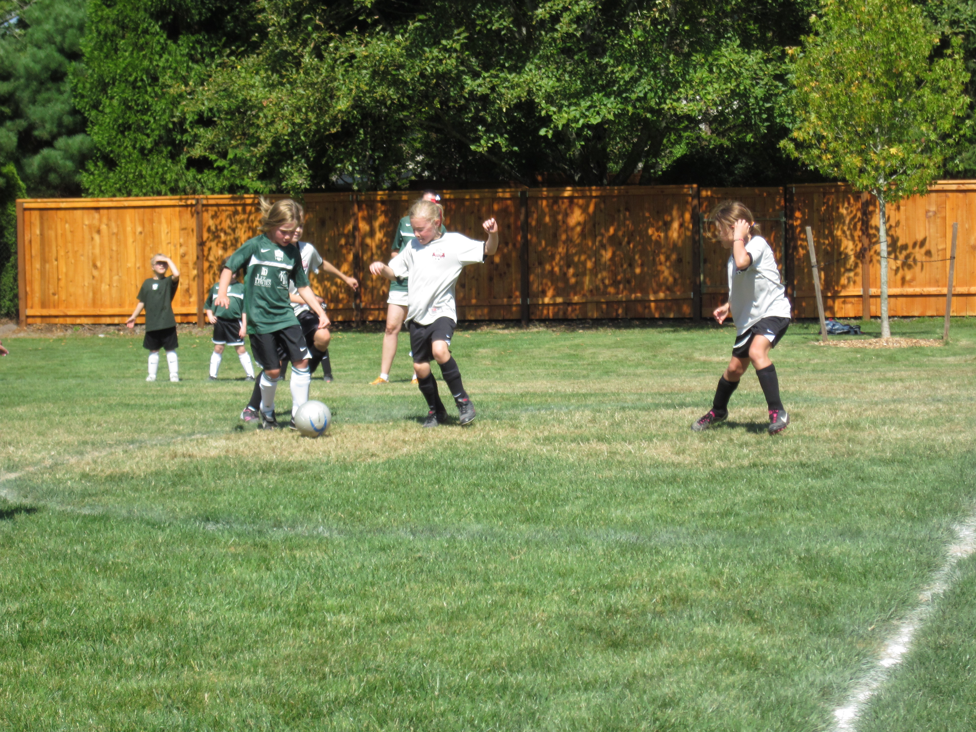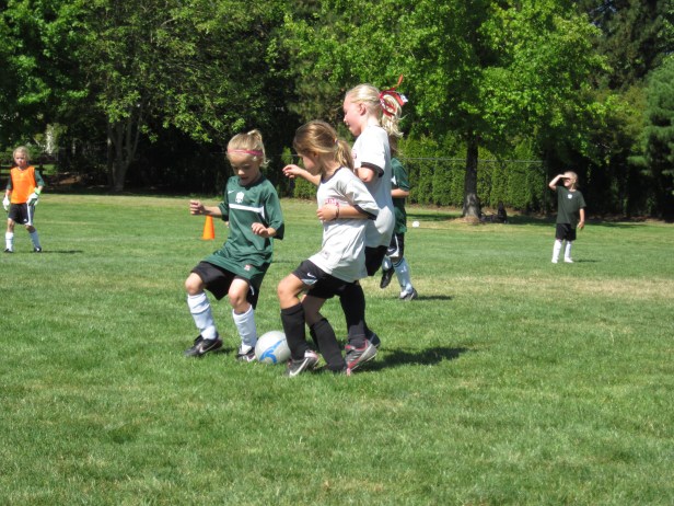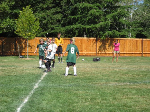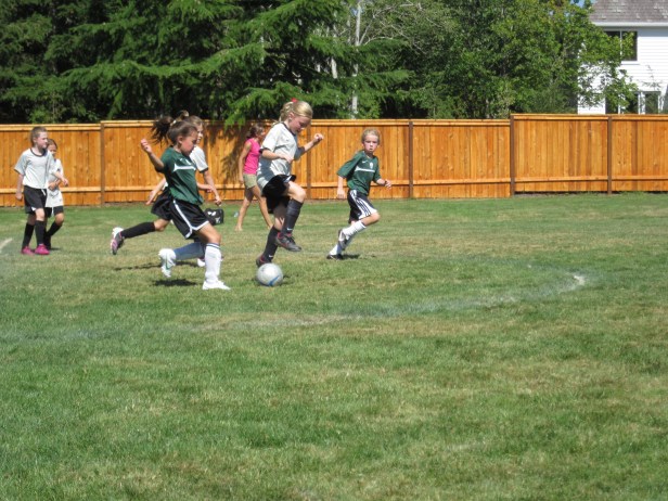 Brooke’s first game was entertaining because most of the girls had never played before and it’s hard to teach “game” rules during practice. It took Brooke a while to get comfortable and understand how to play, but once she did…… LOOK OUT! She did great! Going after the ball and playing hard- laughing and giggling the whole time, too! By half time her team was ahead 3 to 1. Her team won the game something like 4 to 2 if I remember correctly.