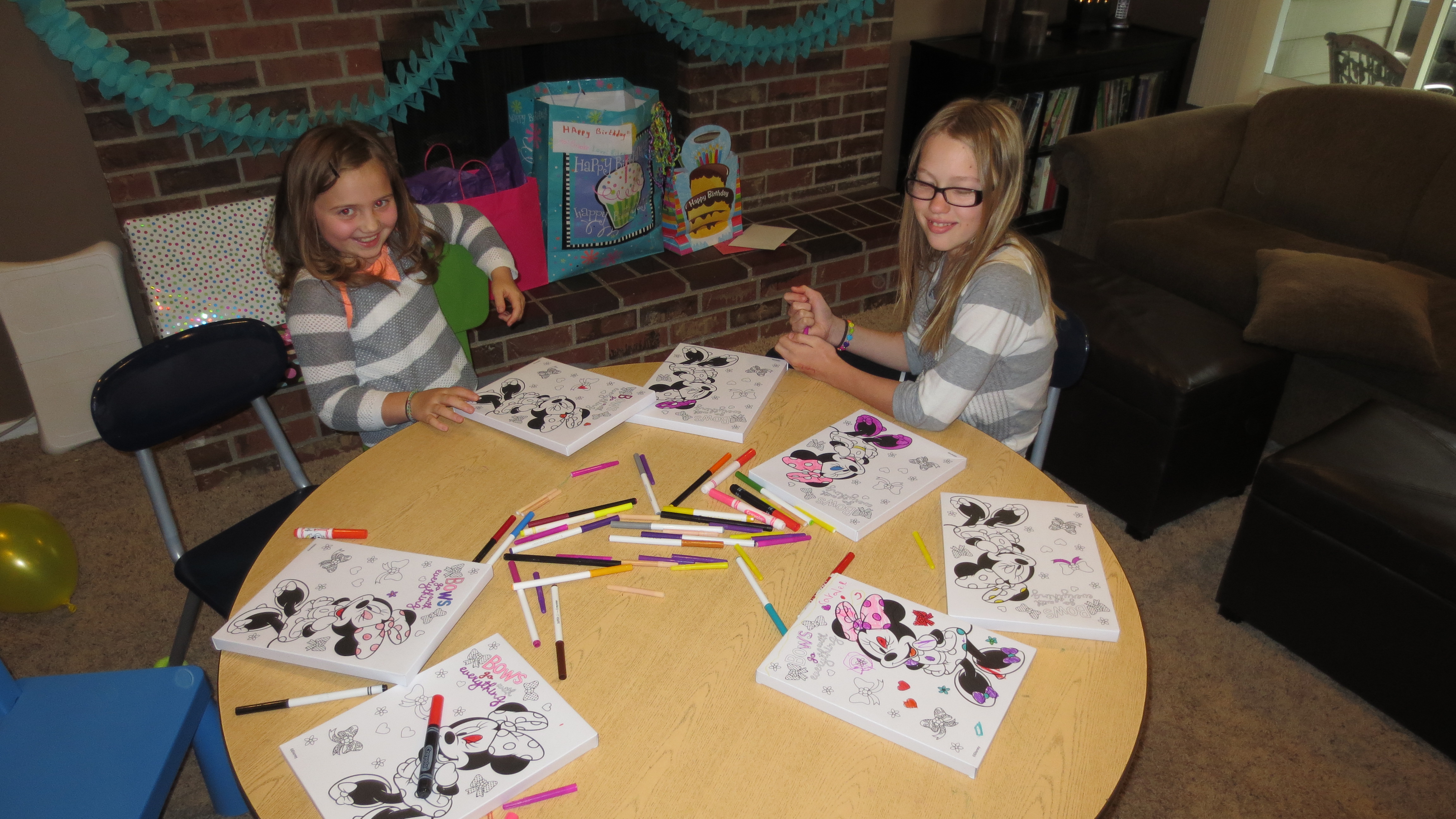 As the girls came in, the first thing they did was color the Minnie Mouse canvas pictures that I picked up at the Dollar Tree.