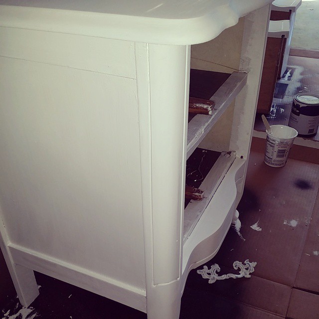 The next day when it was totally dry, I sanded all the chalkpaint globs off- returning the nightstand to a smooth surface (and darkening the teal painted areas with more teal) and after work I went to Lowe’s to buy some Plaster of Paris and a new can of Flat white latex paint- WITHOUT a primer. So now my FREE makeover is costing me money.