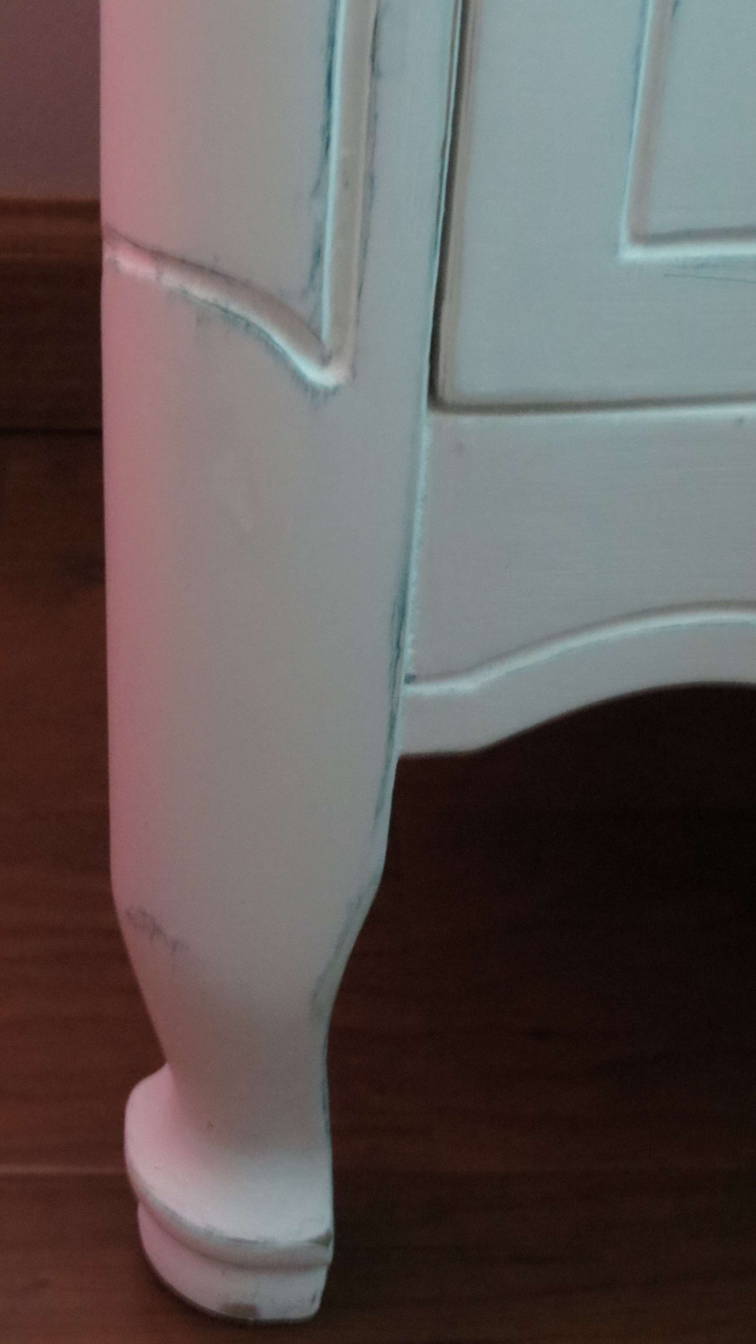 Knowing that I wanted to distress the nightstand with some hints of turquoise, I painted the grooves and edges with some teal paint (the same teal paint that I used in the playroom):