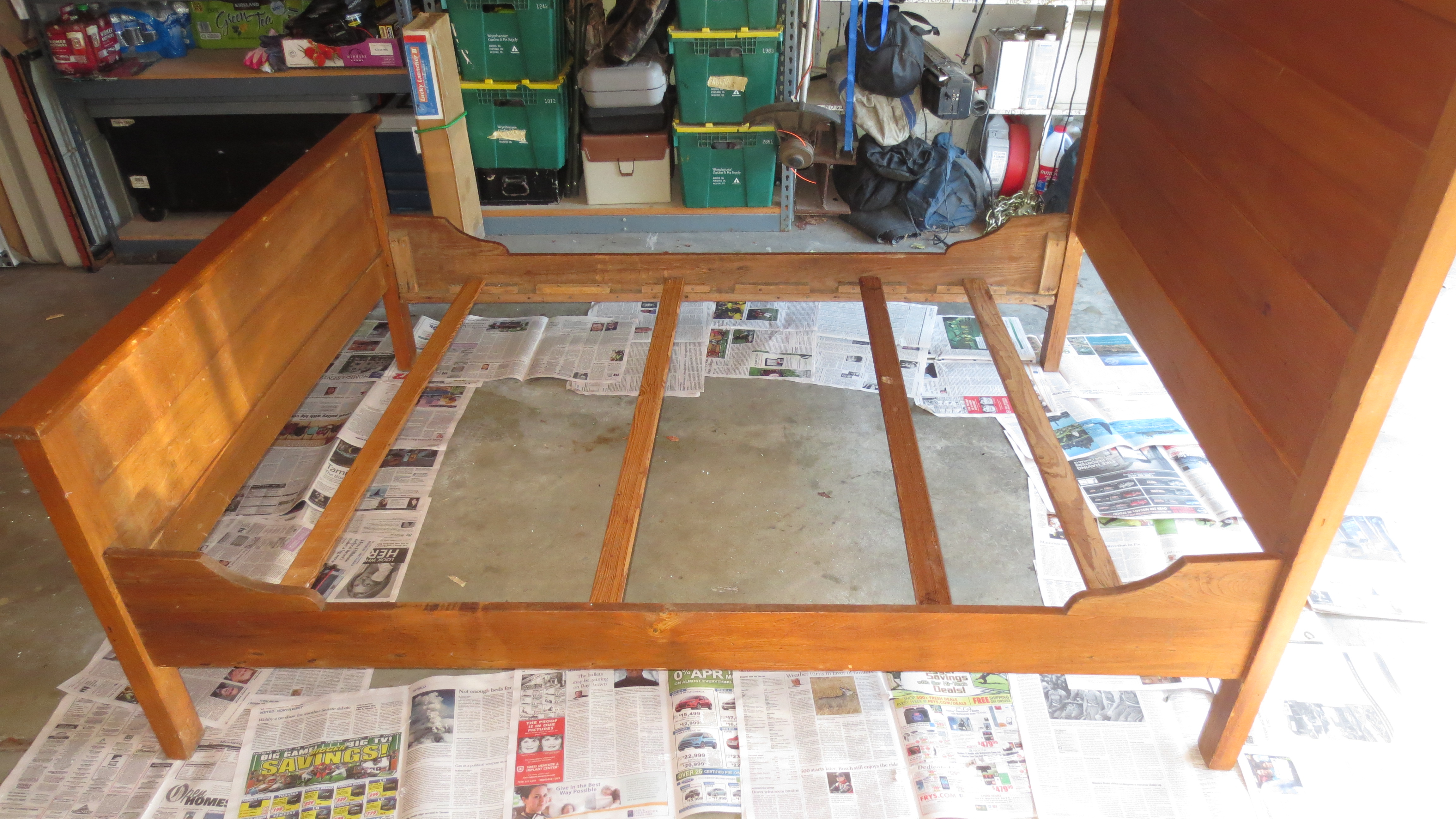 An antique oak full-size high-back bed frame that we picked up just an hour earlier. I had decided to apply the same process- BIN then chalkpaint then distressing (but without teal undertones).