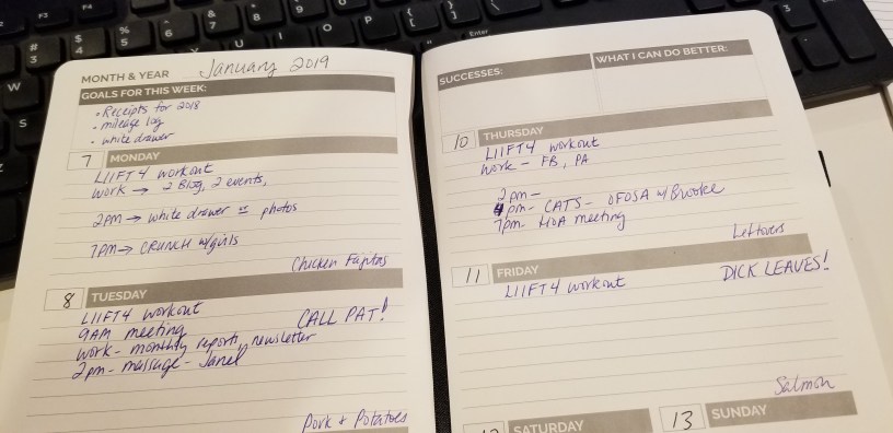 Sometimes you need a little slap in the face reminder from someone. I was told this morning that I should be “scheduling” my workouts so that I’ll DO THEM. I scoffed. Whatever. But then I started thinking….and remembered back to my kickboxing days. I scheduled those. I pre-planned on Sunday which days I would go to the gym and workout. I tried hard to stick to what I had written down. And it worked! So my daily planner will have blocks of exercise- and not just “exercise” but I’m going to write down WHAT I’m going to do so I don’t wake up and have to think about it and plan it… just do it!
