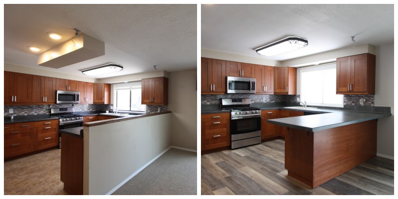 This project went from a simple- let’s have someone level the kitchen cabinets and put on a new countertop….. to…. let’s take out a wall, reconfigure the peninsula with another cabinet, patch the walls, install new countertops and a new backsplash.  AND new flooring!
