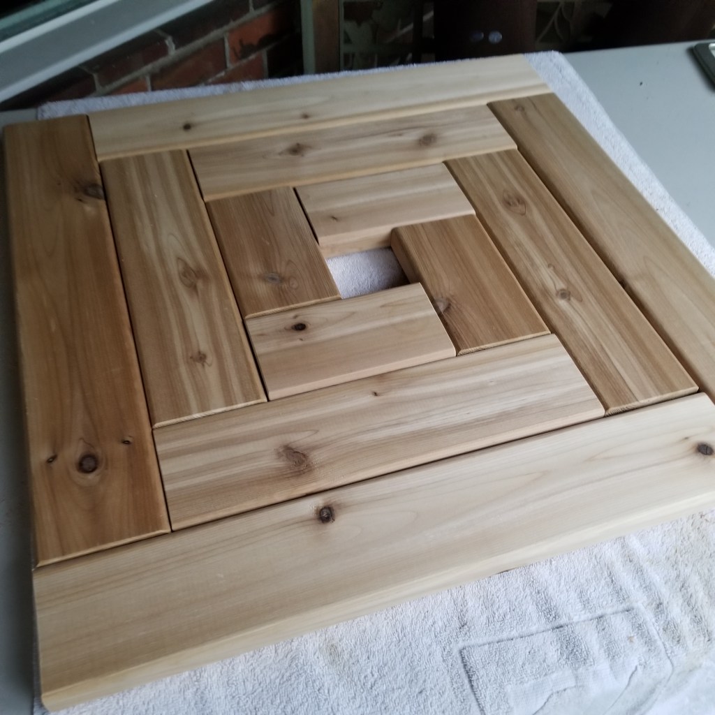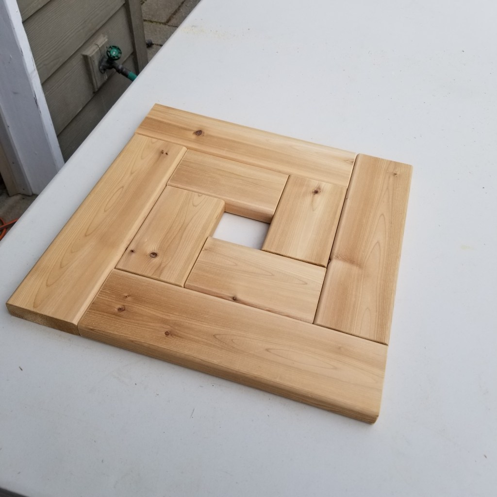 I brainstorm for about a week. My theory is that I can make a square table top and somehow create a box-like structure for the sides that maybe sits on the stand itself. I’ll figure that part out later. For now, let’s at least get the top made!