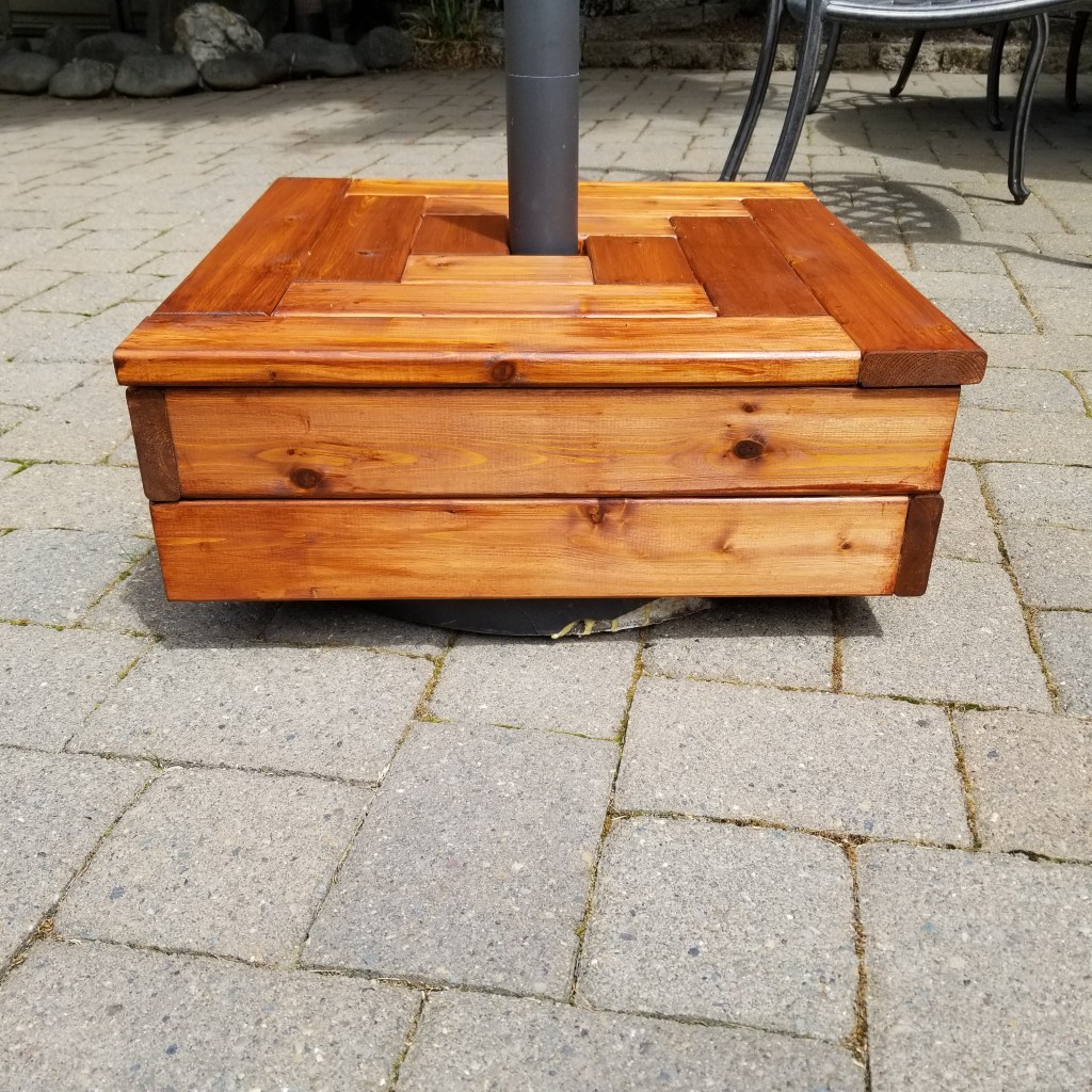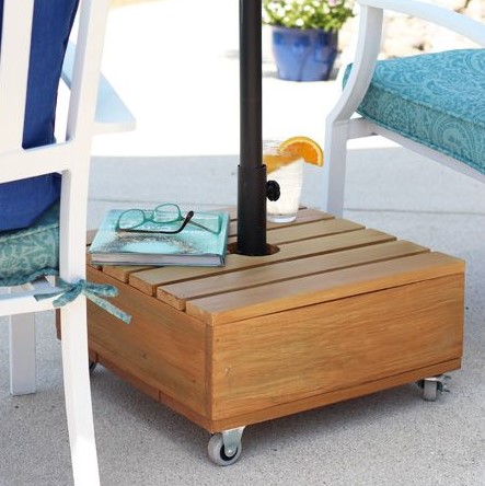 I didn’t like that plan because #1- I didn’t want my precious box actually sitting on the ground and #2- I didn’t want to have to depend on anyone else to help me move the stands. I want to be able to move them on my own, and not need to track down someone or something to hold it up. We keep our umbrellas under the patio cover when not in use… out of the rain. So I really need to be able to move them on my own.